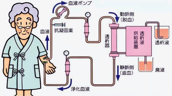 血液透析(hemodialysis, HD)是急慢性腎功能衰竭患者腎臟替代治療方式之一。它通過將體內(nèi)血液引流至體外,經(jīng)一個由無數(shù)根空心纖維組成的透析器中,血液與含機(jī)體濃度相似的電解質(zhì)溶液(透析液)在一根根空心纖維內(nèi)外,通過彌散原理進(jìn)行物質(zhì)交換,清除體內(nèi)的代謝廢物、維持電解質(zhì)和酸堿平衡;同時清除體內(nèi)過多的水分,并將經(jīng)過凈化的血液回輸?shù)恼麄€過程稱為血液透析。